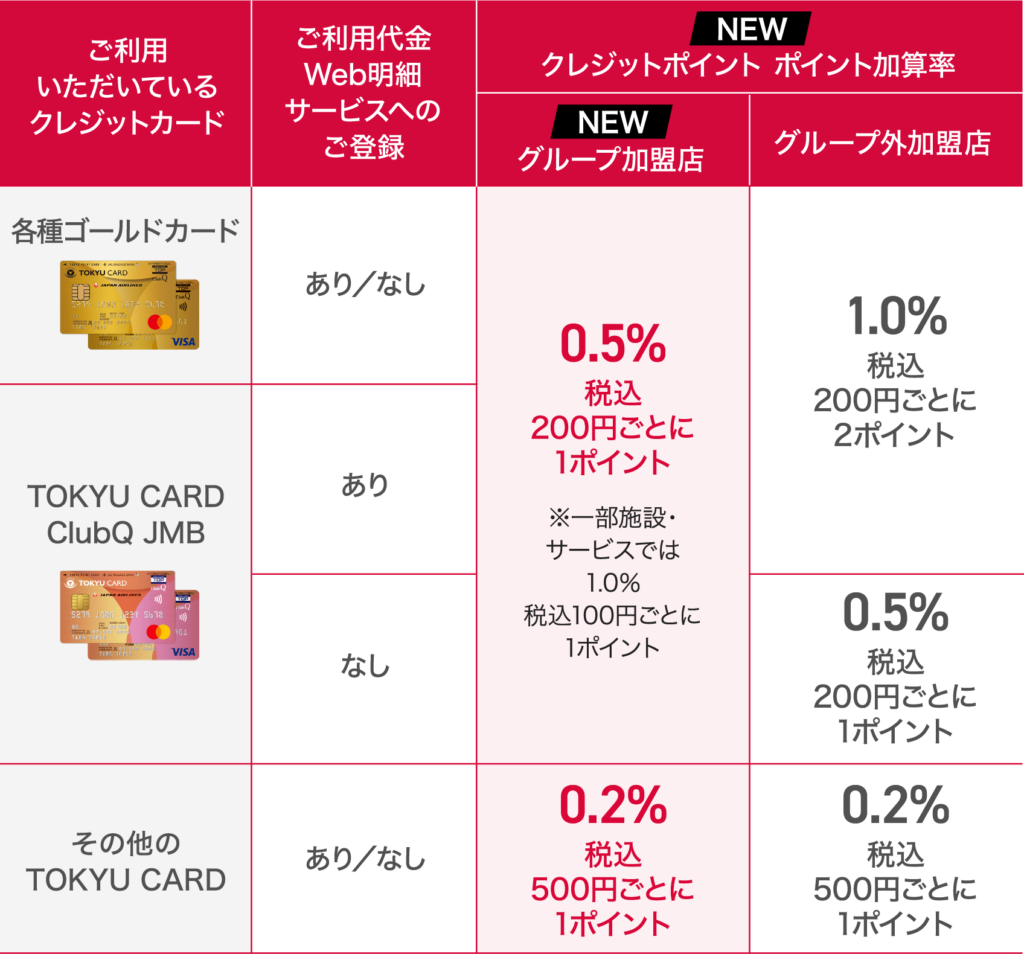クレジットポイントは、カード決済ごとに貯まるポイントで、東急グループでの利用は通常0.5%が基本。東急グループ以外では最大1.0%にアップします。