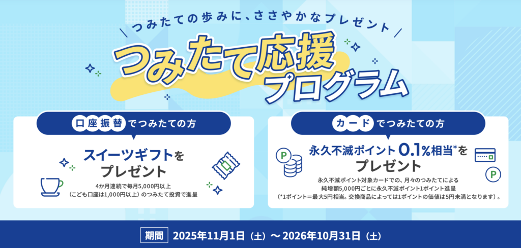 | 特典内容 | 【口座振替でつみたてする場合】 条件達成でスイーツギフトをプレゼント 【カードでつみたてする場合】 つみたて額に対して永久不滅ポイント0.1%相当をプレゼント |