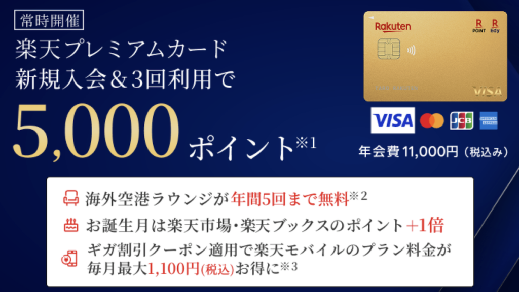| キャンペーン内容 | 楽天プレミアムカード新規入会&利用で合計5,000ポイント進呈 |